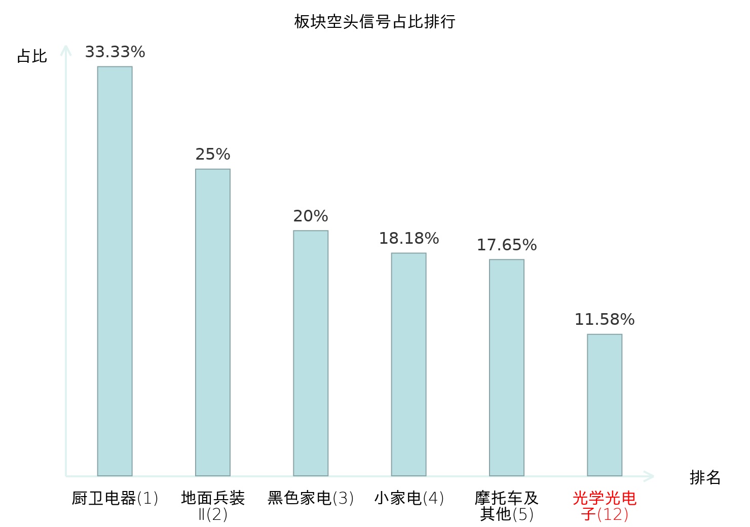 全市场所有行业板块中主力空头信号占比排名中,厨卫电器板块位居第一。服装家纺板块名次提升最快,较昨日上升124位。