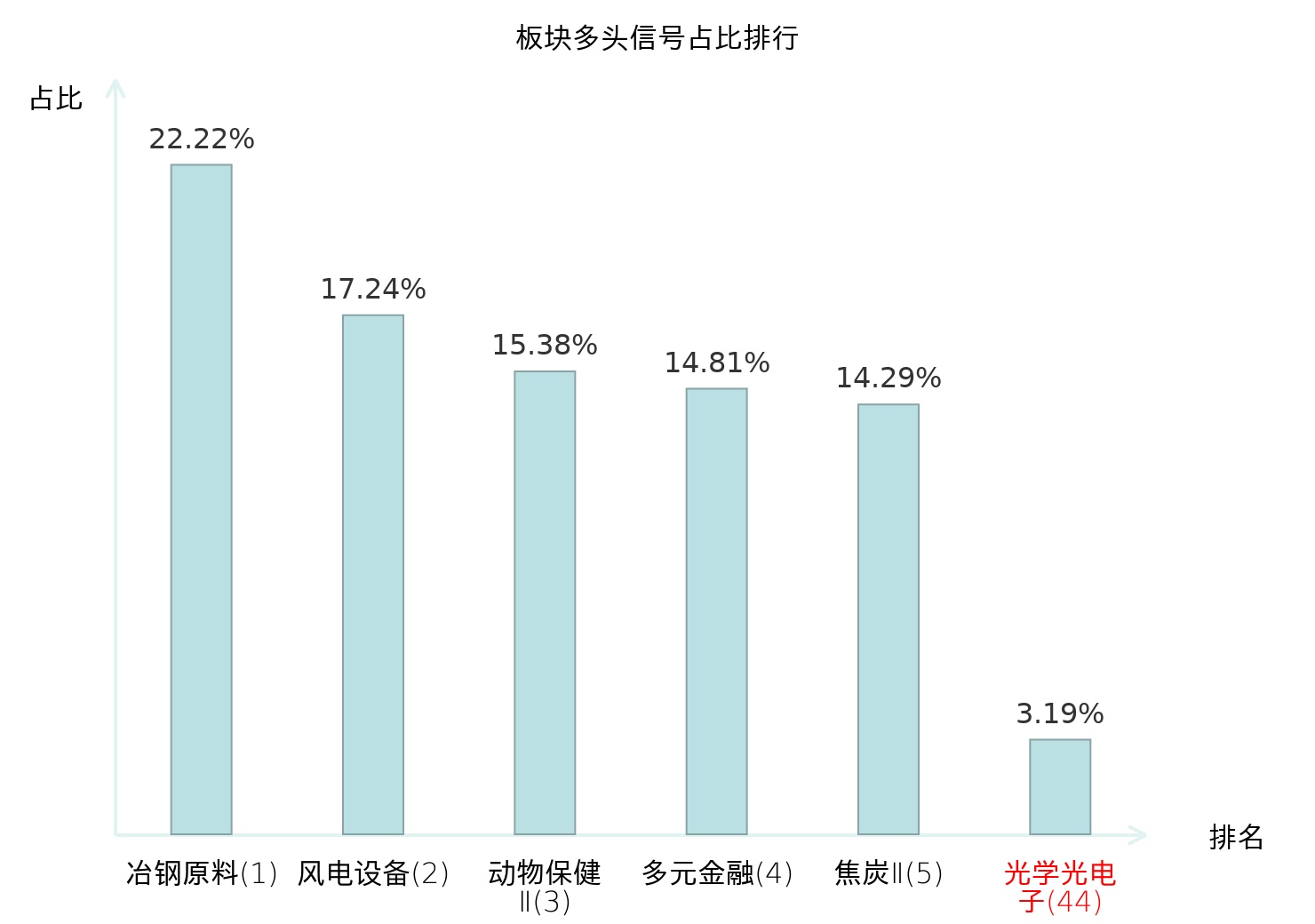 全市场所有行业板块中主力多头信号占比排名中,冶钢原料板块位居第一。冶钢原料板块名次提升最快,较昨日上升118位。