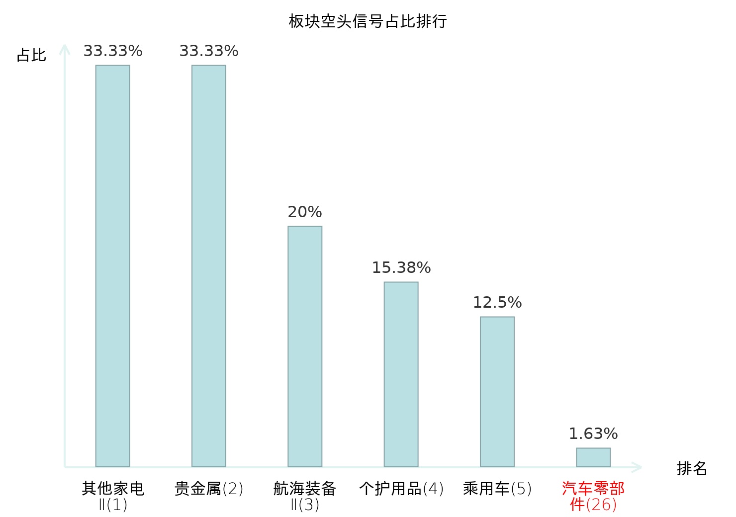 全市场所有行业板块中主力空头信号占比排名中,其他家电Ⅱ板块位居第一。工业金属板块名次提升最快,较昨日上升105位。