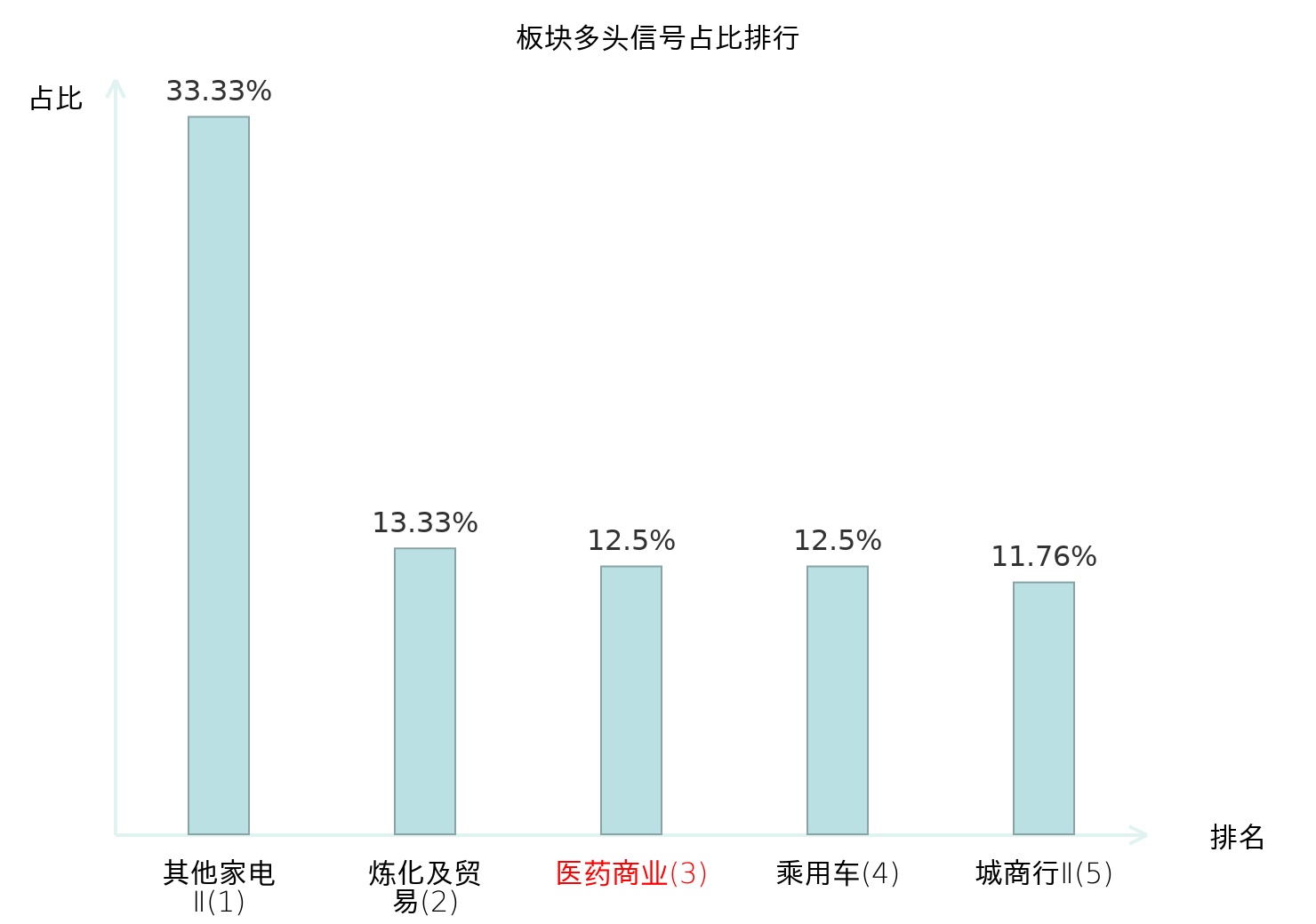 全市场所有行业板块中主力多头信号占比排名中,其他家电Ⅱ板块位居第一。其他家电Ⅱ板块名次提升最快,较昨日上升128位。
