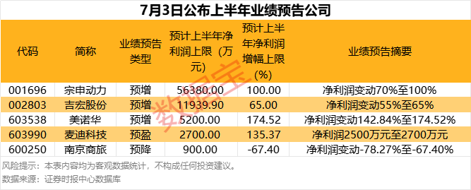 今日共有5家公司公布上半年业绩预告,业绩预告类型来看,预增3家,预盈1家,预降1家。从股价表现看,美诺华今日早盘快速拉升至涨停,收获两连板。
