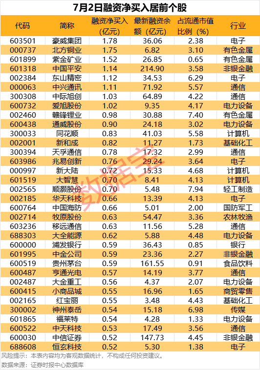 具体到个股,7月2日获融资净买入千万元以上的有398股,其中34股融资净买入额超5000万元。豪威集团融资净买入额居首,当日净买入1.78亿元;其次是北方铜业、紫金矿业,融资净买入金额分别为1.75亿元、1.52亿元;融资净买入金额居前的还有中国平安、东山精密、中兴通讯等。