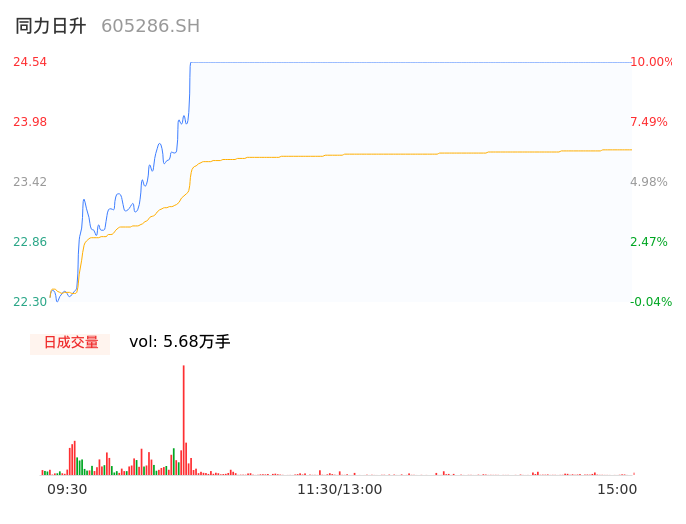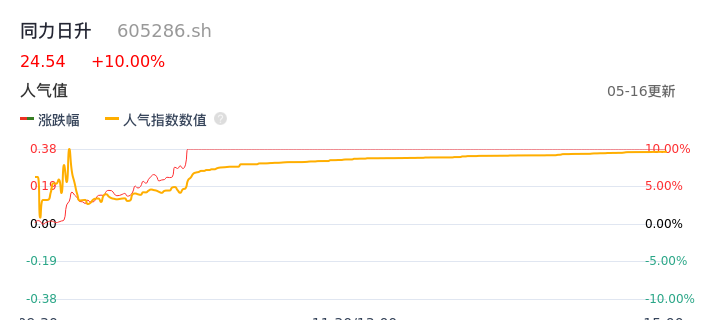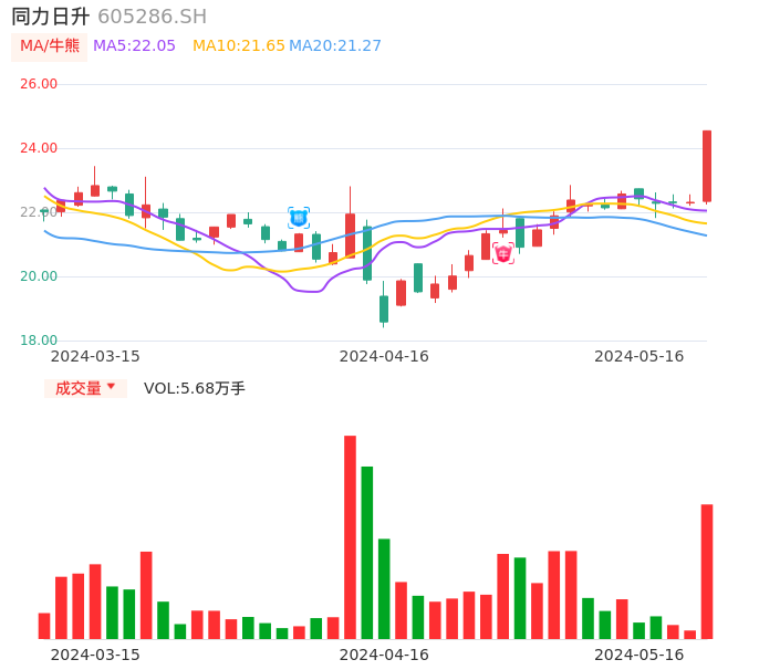 05月16日,同力日升收报24.54,股价涨幅10.00%,成交金额1.35亿元,换手率3.38%。