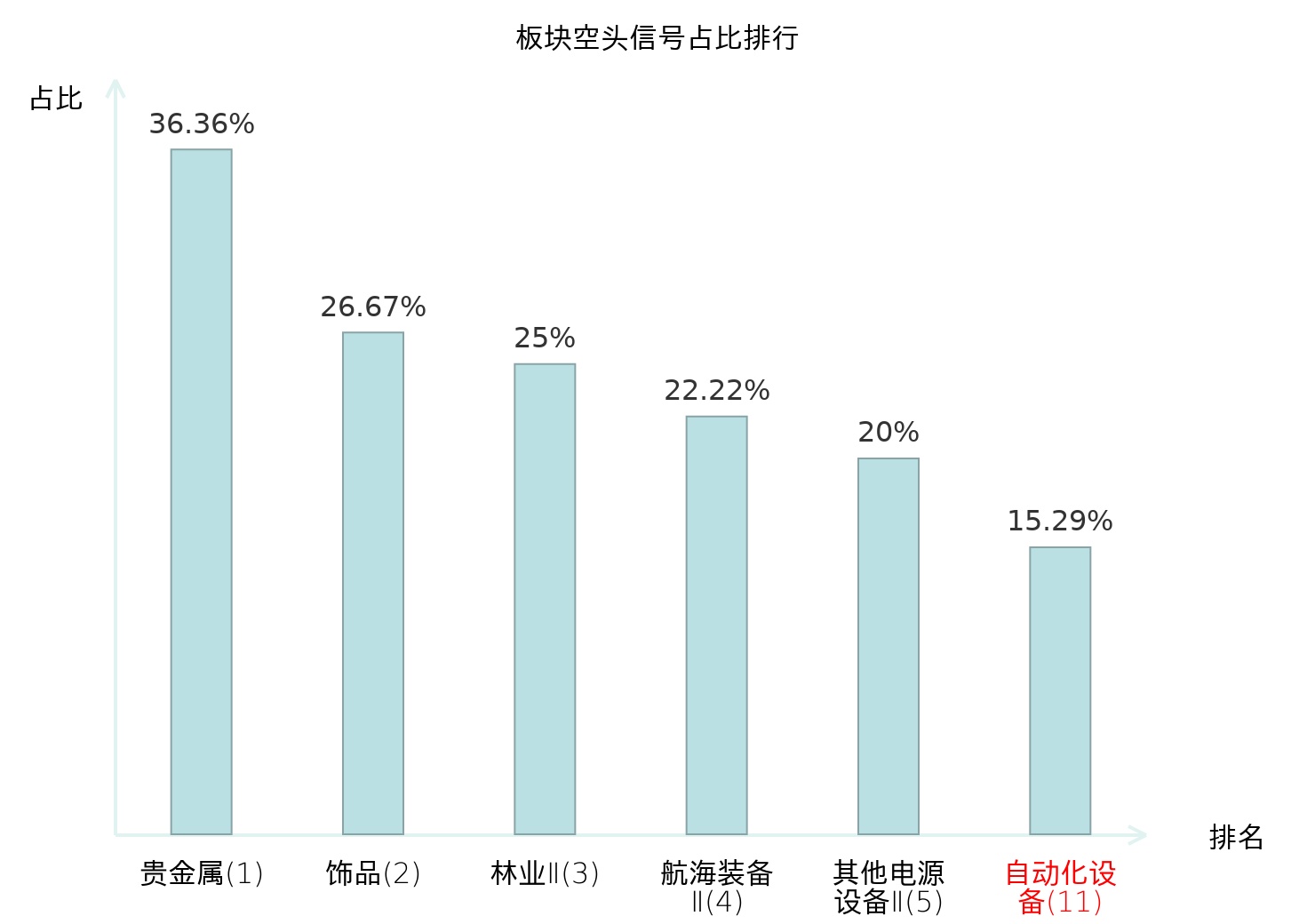 全市场所有行业板块中主力空头信号占比排名中,贵金属板块位居第一。工业金属板块名次提升最快,较昨日上升125位。
