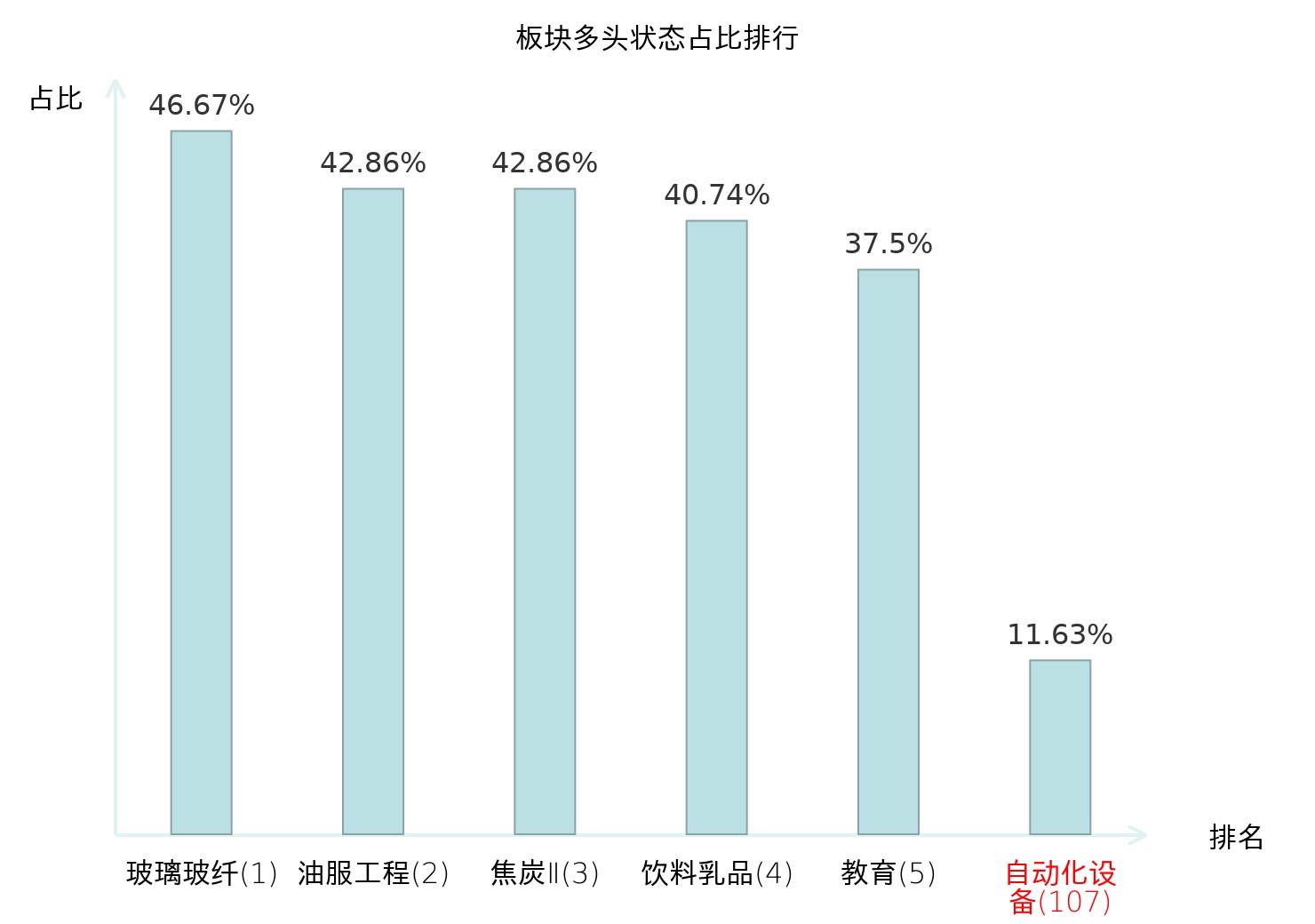 全市场所有行业板块中主力多头状态占比排名中,玻璃玻纤板块位居第一。航空机场板块名次提升最快,较昨日上升43位。