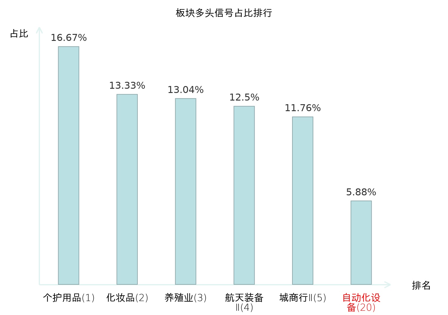 全市场所有行业板块中主力多头信号占比排名中,个护用品板块位居第一。航天装备Ⅱ板块名次提升最快,较昨日上升118位。