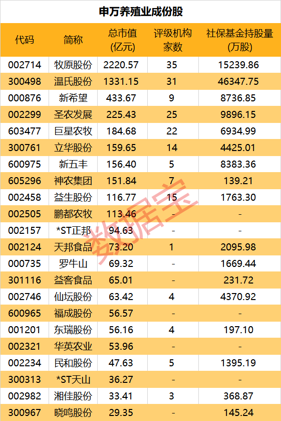 证券时报·数据宝统计,申万养殖业板块共计22股。从市值规模来看,千亿市值股有2只,为牧原股份和温氏股份。最新市值依次为2220.57亿元、1331.15亿元。从机构关注度来看,牧原股份、温氏股份、圣农发展、巨星农牧评级机构位列板块前四,依次有35家、31家、25家、22家;益生股份、立华股份评级机构家数在10家以上。