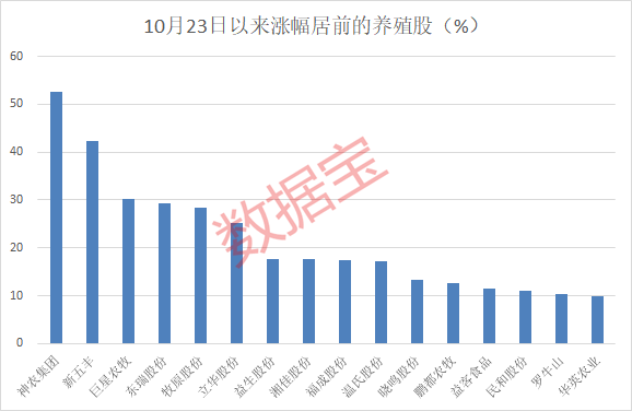 将时间线拉长,10月23日低点至今,申万养殖业指数累计涨幅达到18.22%,位于二级行业指数涨幅榜前列。成份股中,神农集团、新五丰、巨星农牧累计涨幅排名前三,依次为52.53%、42.37%、30.14%;东瑞股份、牧原股份、立华股份累计涨幅也在25%以上。