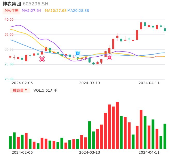 04月11日,神农集团收报36.16,股价涨幅-3.98%,成交金额2.05亿元,换手率8.31%。