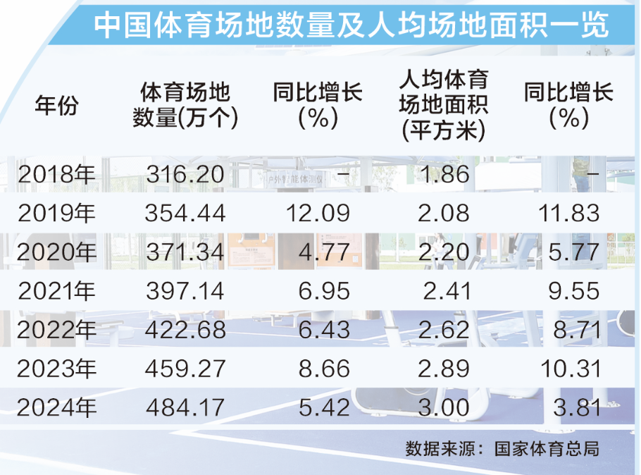 近些年来,我国持续推进场地设施建设,就是为了解决全民健身道路上所面临的“牛鼻子”问题。根据国家体育总局数据,截至2024年底,全国体育场地增至484.17万个,同比增长5.42%;体育场地面积为42.3亿平方米,人均体育场地面积增至3.0平方米。