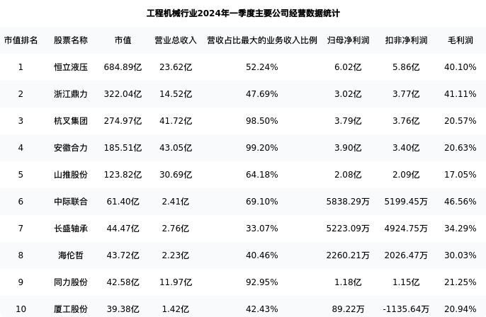 中际联合最新报告期数据为一季度,下表汇总了工程机械行业内市值靠前的公司一季度主要经营数据