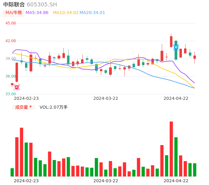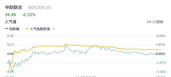 04月22日,中际联合收报39.49,股价涨幅-0.10%,成交金额8145.80万元,换手率1.95%。