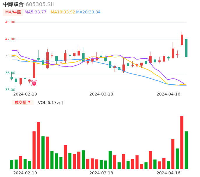 04月16日,中际联合收报38.86,股价涨幅-9.14%,成交金额2.48亿元,换手率5.81%。