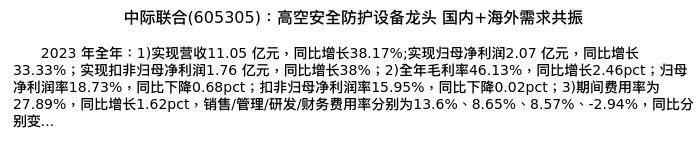 值得注意的是:2024年04月天风证券的分析师,首次发布关于中际联合的研究报告,标题为:中际联合(605305):高空安全防护设备龙头 国内+海外需求共振。