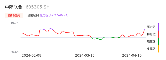 我们来看一下该股的九方特色指标强弱趋势的情况:中际联合近日从持仓区进入压力区。股价出现一波快速拉升行情,目前上升动能较为充足可继续持股。注意今日上方压力位:46.74元是否能有效突破。