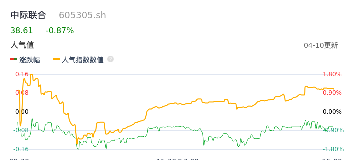 04月10日,中际联合收报38.61,股价涨幅-0.87%,成交金额4784.40万元,换手率1.17%。