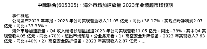 值得注意的是:2024年04月华西证券的分析师,首次发布关于中际联合的研究报告,标题为:中际联合(605305):海外市场加速放量 2023年业绩超市场预期。