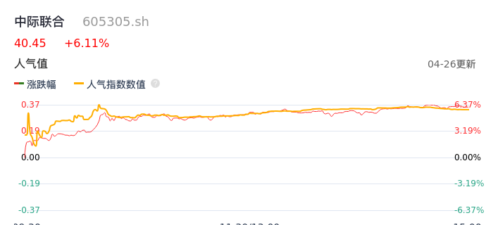 04月26日,中际联合收报40.45,股价涨幅6.11%,成交金额1.40亿元,换手率3.31%。