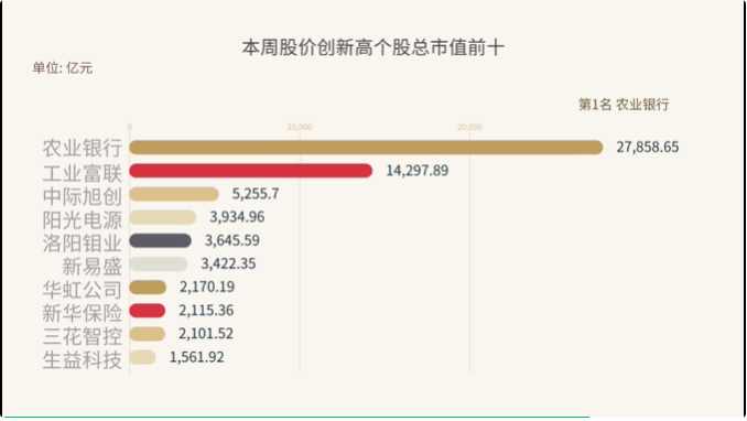 总市值方面,上述创新高的股票中,A股总市值超千亿元的个股有14只,较上周的2只大幅增加,大市值龙头股表现活跃。总市值居前的有农业银行、工业富联、中际旭创、阳光电源、洛阳钼业,分别为27858.65亿元、14297.89亿元、5255.70亿元、3934.96亿元、3645.59亿元。