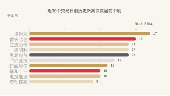从近30个交易日股价创新高次数来看,上述107只个股中,法狮龙有17次创新高,香农芯创有15次创新高,应流股份有14次创新高,德明利有14次创新高,思源电气有14次创新高。