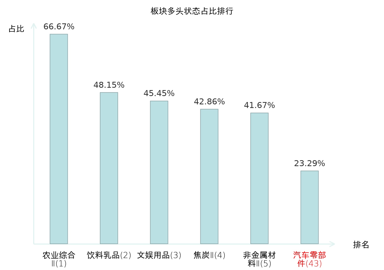 全市场所有行业板块中主力多头状态占比排名中,农业综合Ⅱ板块位居第一。特钢Ⅱ板块名次提升最快,较昨日上升46位。