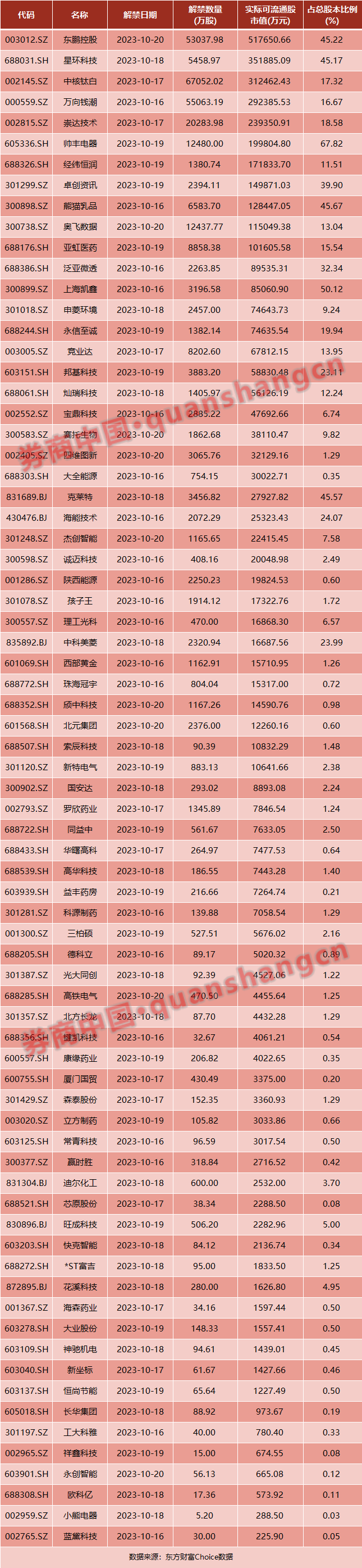 数据显示,本周(10月16日~10月20日)共有53家公司限售股陆续解禁,合计解禁量30.48亿股,按10月13日收盘价计算,解禁市值为360.62亿元。