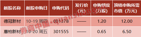 本周(10月16日~10月20日)共有2只新股申购。周四1只:德冠新材;周五1只:惠柏新材。
