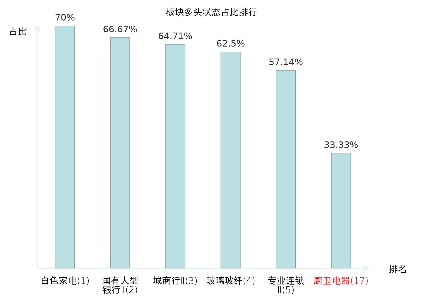 全市场所有行业板块中主力多头状态占比排名中,白色家电板块位居第一。油气开采Ⅱ板块名次提升最快,较昨日上升96位。