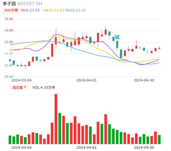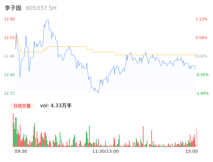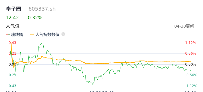 04月30日,李子园收报12.42,股价涨幅-0.32%,成交金额5400.79万元,换手率1.10%。