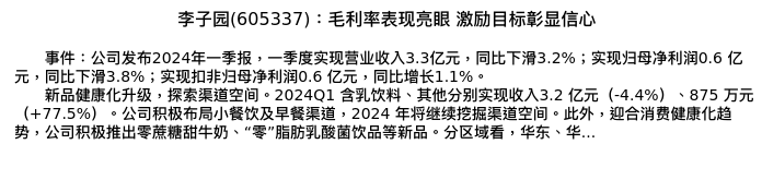 值得注意的是:2024年05月西南证券的朱会振/夏霁分析师,首次发布关于李子园的研究报告,标题为:李子园(605337):毛利率表现亮眼 激励目标彰显信心。