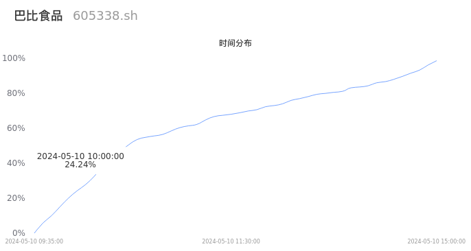 605338巴比食品2024年05月10日成交1.88万手,成交金额3301.31万元,相较昨日放量1.00万手,换手率0.76%,成交清淡。