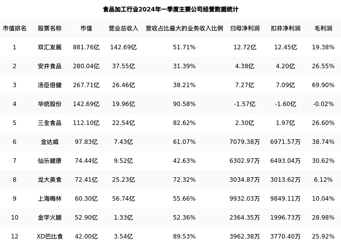XD巴比食最新报告期数据为一季度,下表汇总了食品加工行业内市值靠前的公司一季度主要经营数据