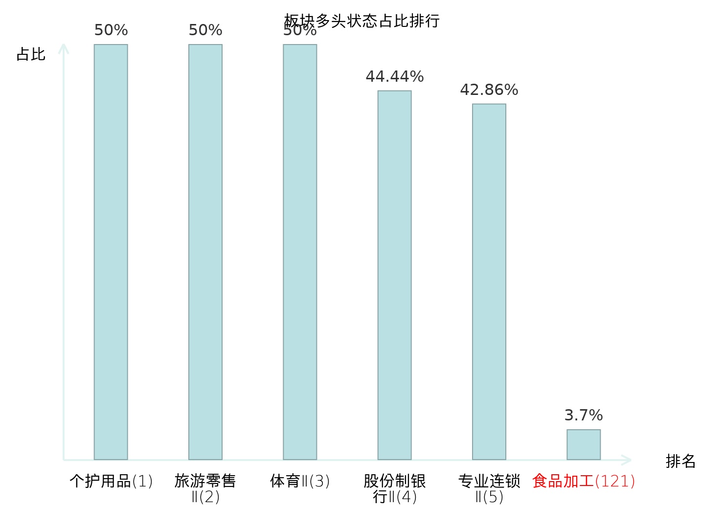 全市场所有行业板块中主力多头状态占比排名中,个护用品板块位居第一。非金属材料Ⅱ板块名次提升最快,较昨日上升37位。