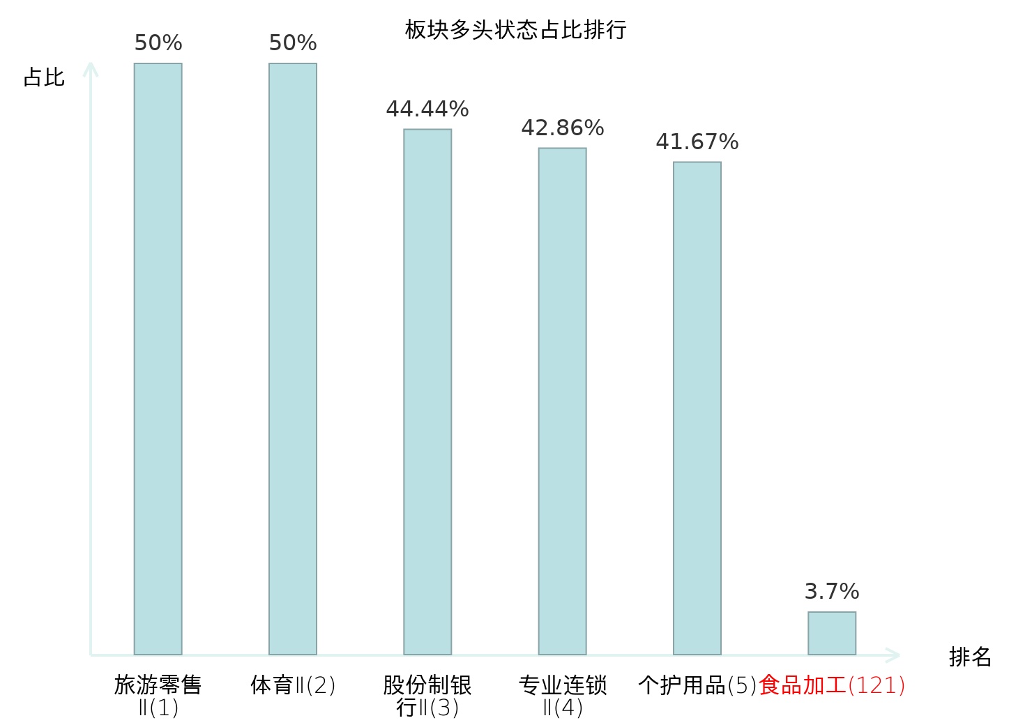 全市场所有行业板块中主力多头状态占比排名中,旅游零售Ⅱ板块位居第一。贵金属板块名次提升最快,较昨日上升83位。
