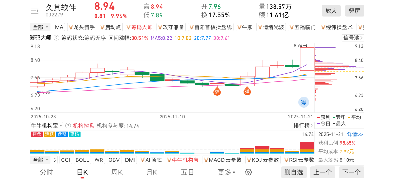 2)20251121-久其软件-002279-【筹码大师】和【牛牛机构宝】-近期出现弹信号且底部量柱由绿转红