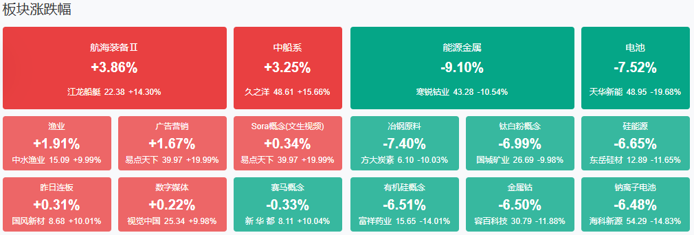 板块方面,中船系、AI应用等板块涨幅居前,电池、硅能源、锂矿等板块跌幅居前。截至收盘,沪指跌2.41%,深成指跌3.41%,创业板指跌4.02%。