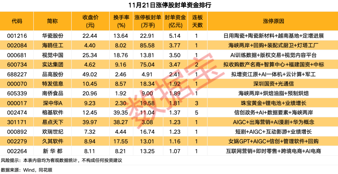 以封单金额计算,今日13股封单资金超过1亿元。其中,华瓷股份、海鸥住工、视觉中国、实达集团、品高股份封单资金均逾2亿元,依次为5.14亿元、3.77亿元、3.5亿元、3.47亿元、2.41亿元。