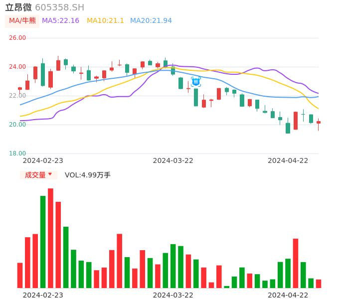 04月22日,立昂微收报20.22,股价涨幅0.45%,成交金额1.00亿元,换手率0.74%。