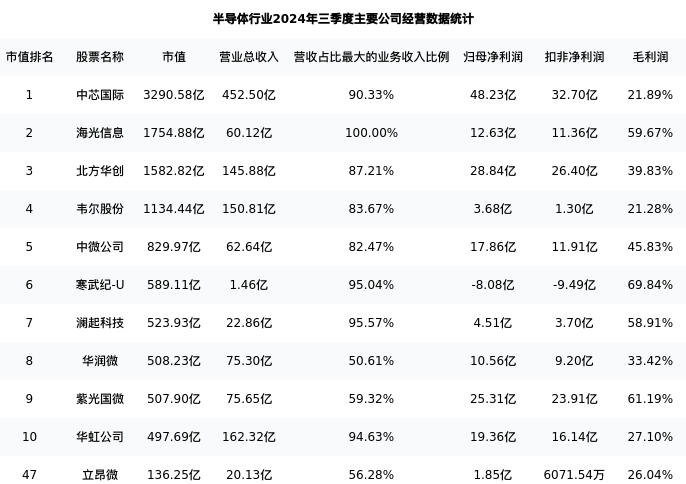 立昂微最新报告期数据为三季度,下表汇总了半导体行业内市值靠前的公司三季度主要经营数据