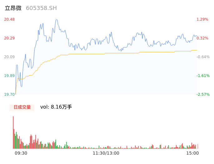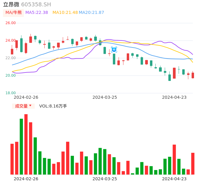 04月23日,立昂微收报20.31,股价涨幅0.45%,成交金额1.64亿元,换手率1.21%。