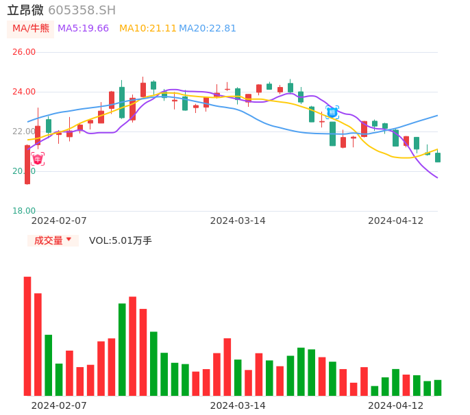 04月12日,立昂微收报20.46,股价涨幅-1.78%,成交金额1.04亿元,换手率0.74%。