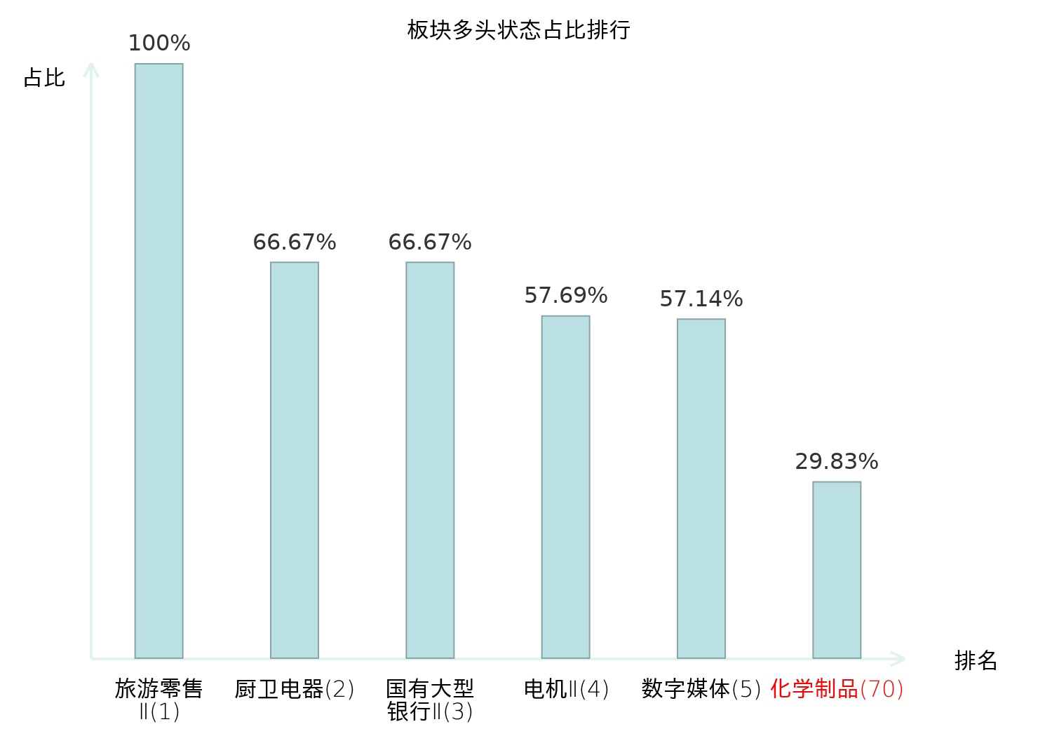 全市场所有行业板块中主力多头状态占比排名中,旅游零售Ⅱ板块位居第一。汽车服务板块名次提升最快,较昨日上升70位。