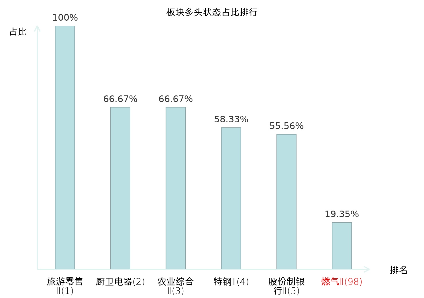 全市场所有行业板块中主力多头状态占比排名中,旅游零售Ⅱ板块位居第一。农商行Ⅱ板块名次提升最快,较昨日上升78位。