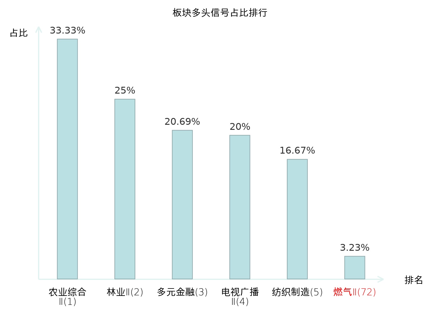 全市场所有行业板块中主力多头信号占比排名中,农业综合Ⅱ板块位居第一。农业综合Ⅱ板块名次提升最快,较昨日上升127位。