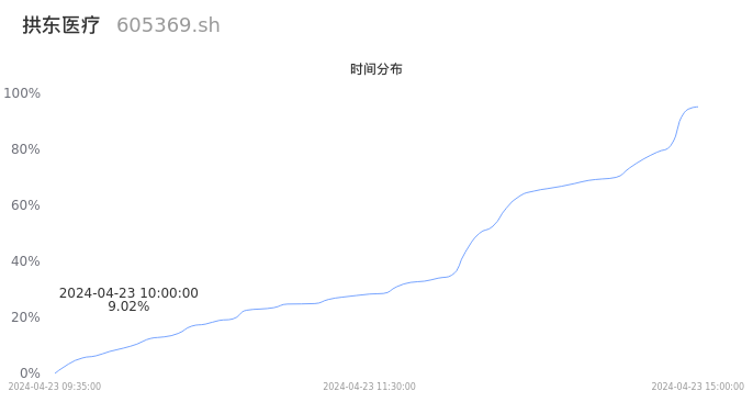 605369拱东医疗2024年04月23日成交3913手,成交金额1727.40万元,相较昨日放量1112手,换手率0.35%,成交清淡。