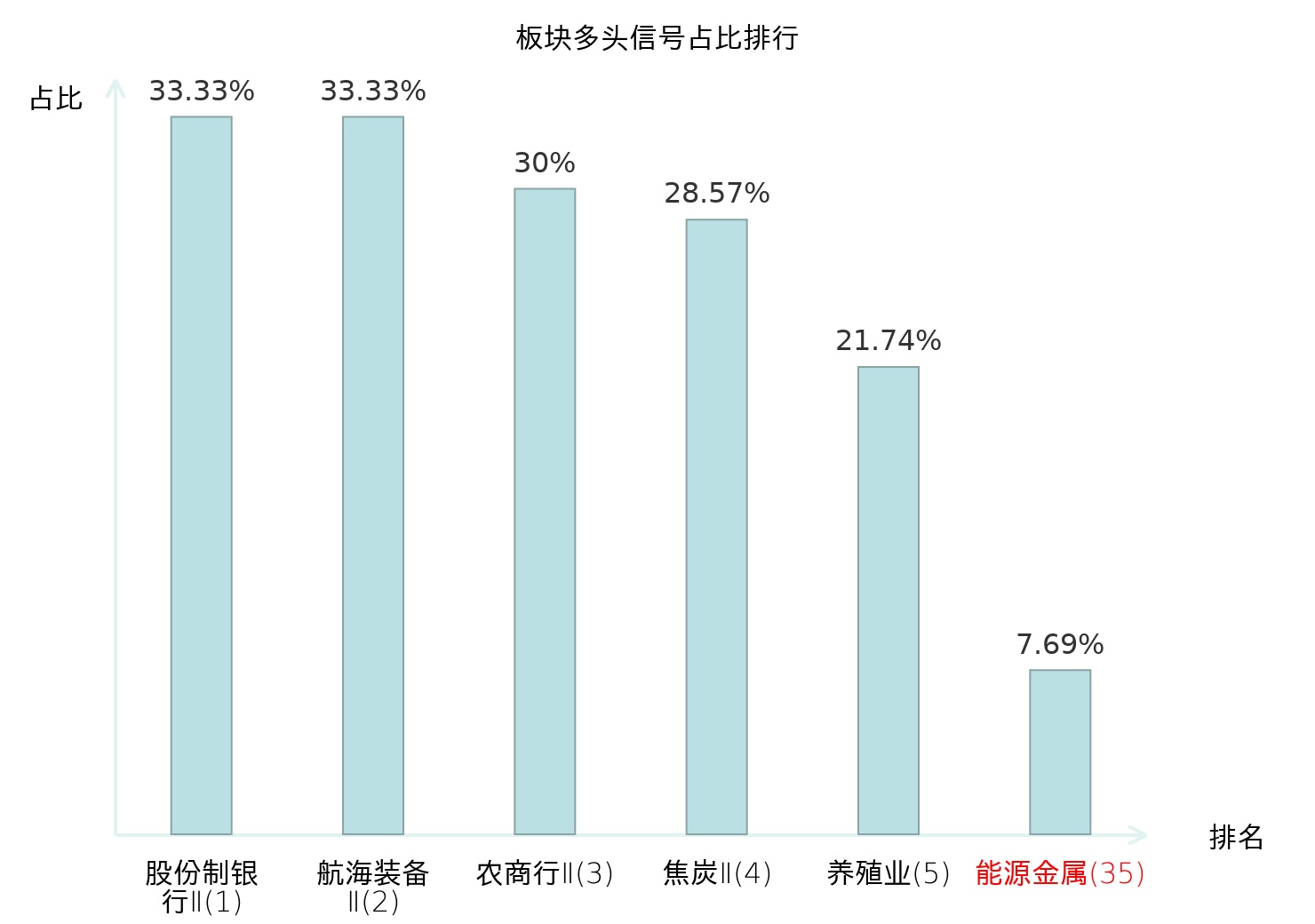 全市场所有行业板块中主力多头信号占比排名中,股份制银行Ⅱ板块位居第一。焦炭Ⅱ板块名次提升最快,较昨日上升119位。