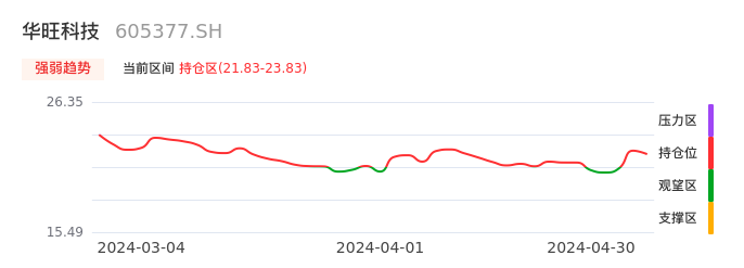 我们来看一下该股的九方特色指标强弱趋势的情况:华旺科技近日从观望区上穿到持仓区。股价短期站上多头区域,但还未完全站稳。后续重点关注多空分界点的争夺:21.83元。如未能有效站稳则可能重新回到空头行情。