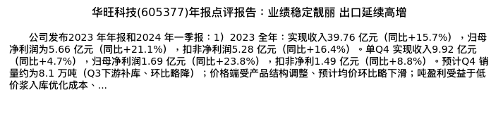 值得注意的是:2024年04月国盛证券的姜文镪分析师,首次发布关于华旺科技的研究报告,标题为:华旺科技(605377)年报点评报告:业绩稳定靓丽 出口延续高增。