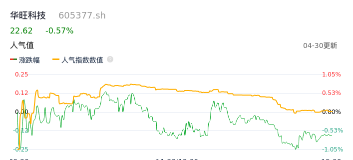 04月30日,华旺科技收报22.62,股价涨幅-0.57%,成交金额8491.29万元,换手率1.13%。