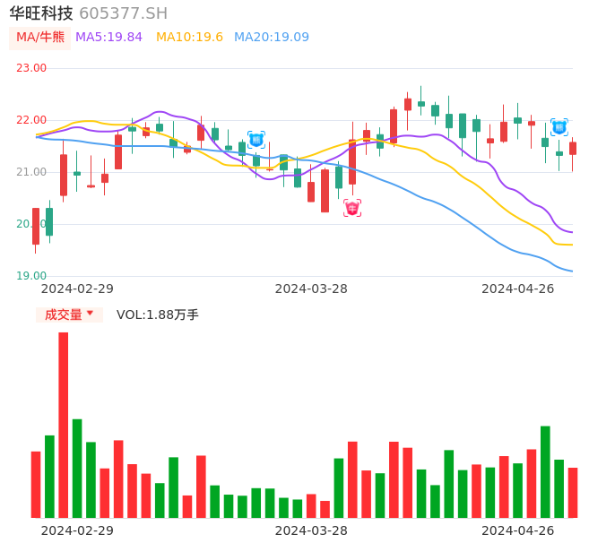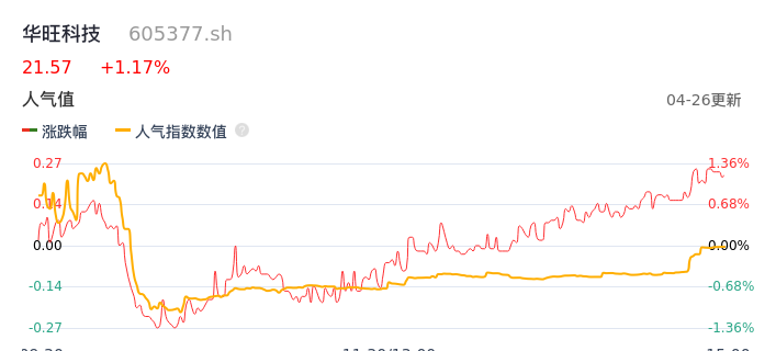 04月26日,华旺科技收报21.57,股价涨幅1.17%,成交金额4013.66万元,换手率0.57%。